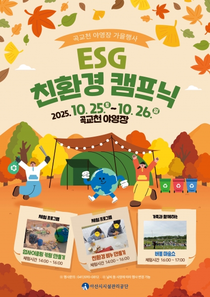 [충청25시] 아산시시설관리공단은 오는 10월 25일부터 26일까지 이틀간 곡교천 야영장에서 ‘ESG 친환경 캠프닉’ 행사를 개최한다고 밝혔다.