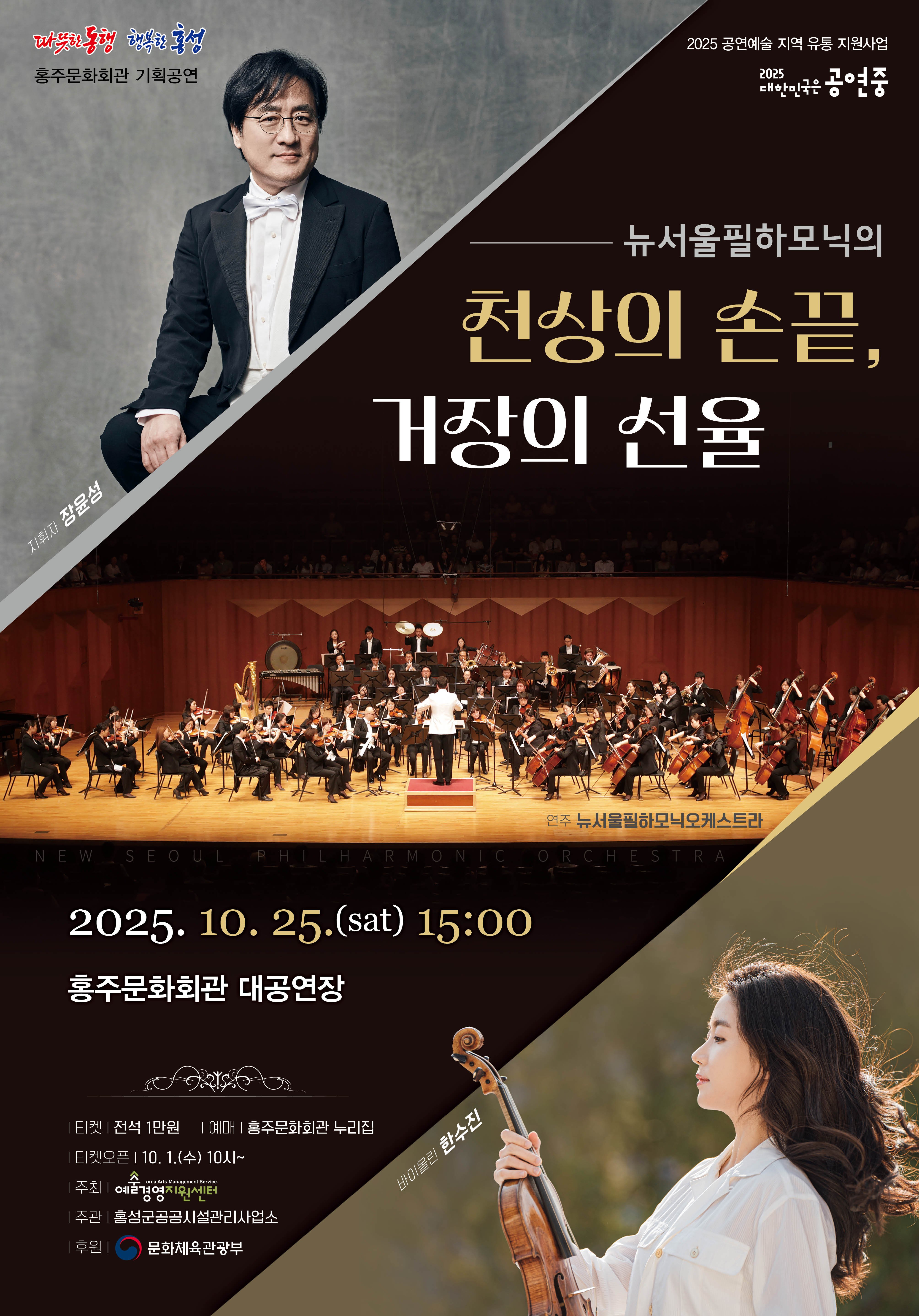 [충청25시] 깊어가는 가을에 어울리는 정통 클래식 오케스트라 공연 ‘뉴서울필하모닉의 천상의 손끝, 거장의 선율’ 이 오는 25일 오후 3시, 홍성군 홍주문화회관에서 열린다.