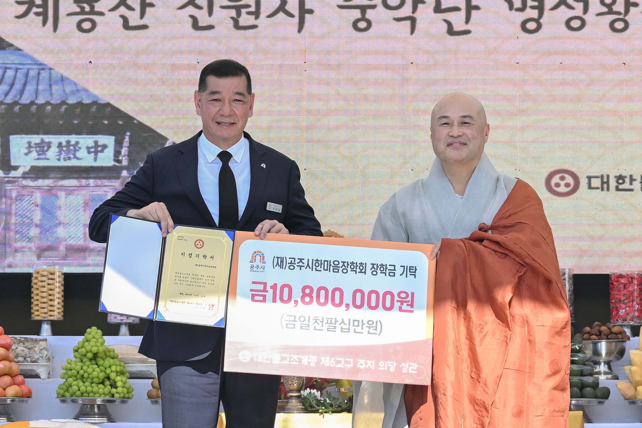 [충청25시] 대한불교조계종 제6교구 신원사(주지 의당 성관)는 지난 11일 공주지역 청소년들의 교육 지원을 위해 장학금 1,080만원을 (재)공주시한마음장학회(이사장 최원철)에 기탁했다.