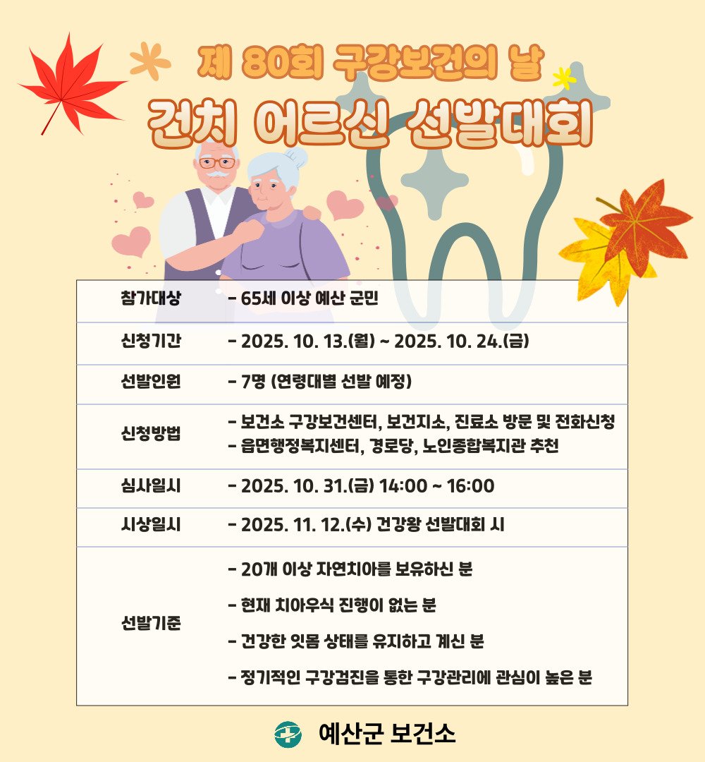 [충청25시] 예산군보건소는 ‘제80회 구강보건의 날’을 맞아 건강하고 활기찬 구강생활 실천 분위기 조성을 위해 건치어르신 선발대회를 개최한다.