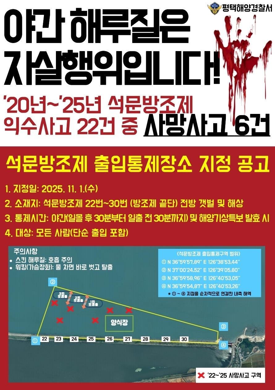 당진시는 계도기간 동안 전광판을 활용해 야간 출입 통제 홍보물을 송출할 계획이며 11월 대조기 기간 평택해경과 합동 단속을 나설 예정이다.