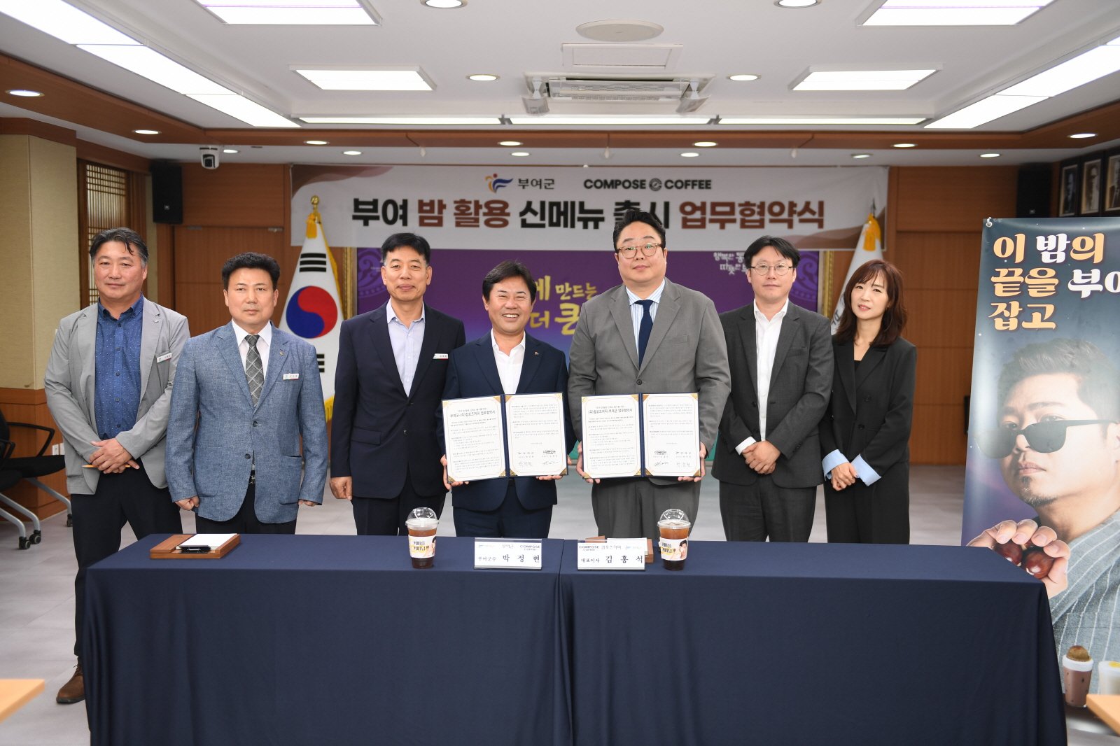 이번 협약에 따라 부여군은 지역 농특산물의 우수성을 알리며 지역 브랜드 가치를 향상하고 컴포즈커피는 부여 밤을 원재료로 활용한 신메뉴를 새롭게 선보인다.