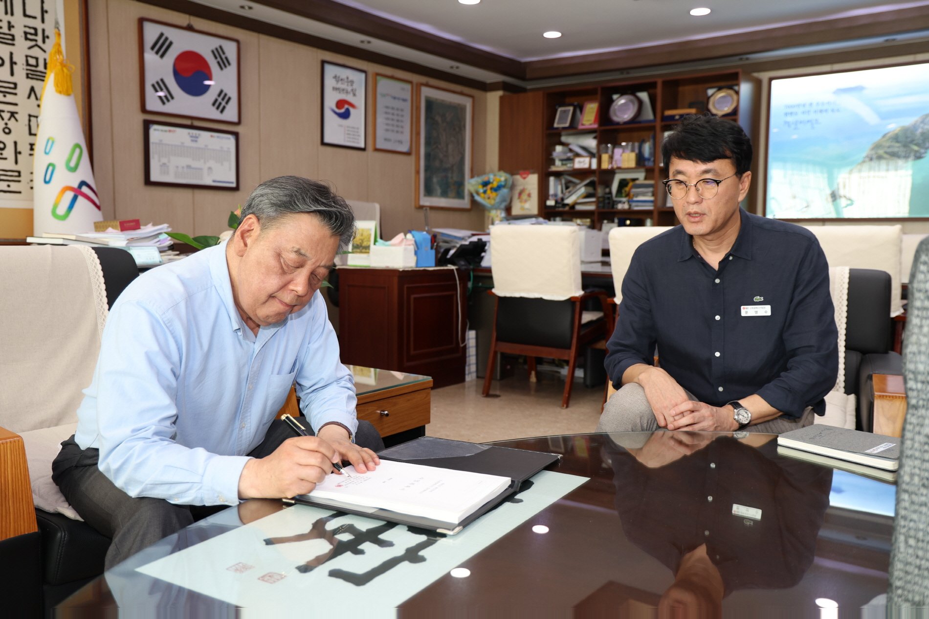 ‘사진설명’ 집적화단지 신청서에 서명 중인 가세로 태안군수.