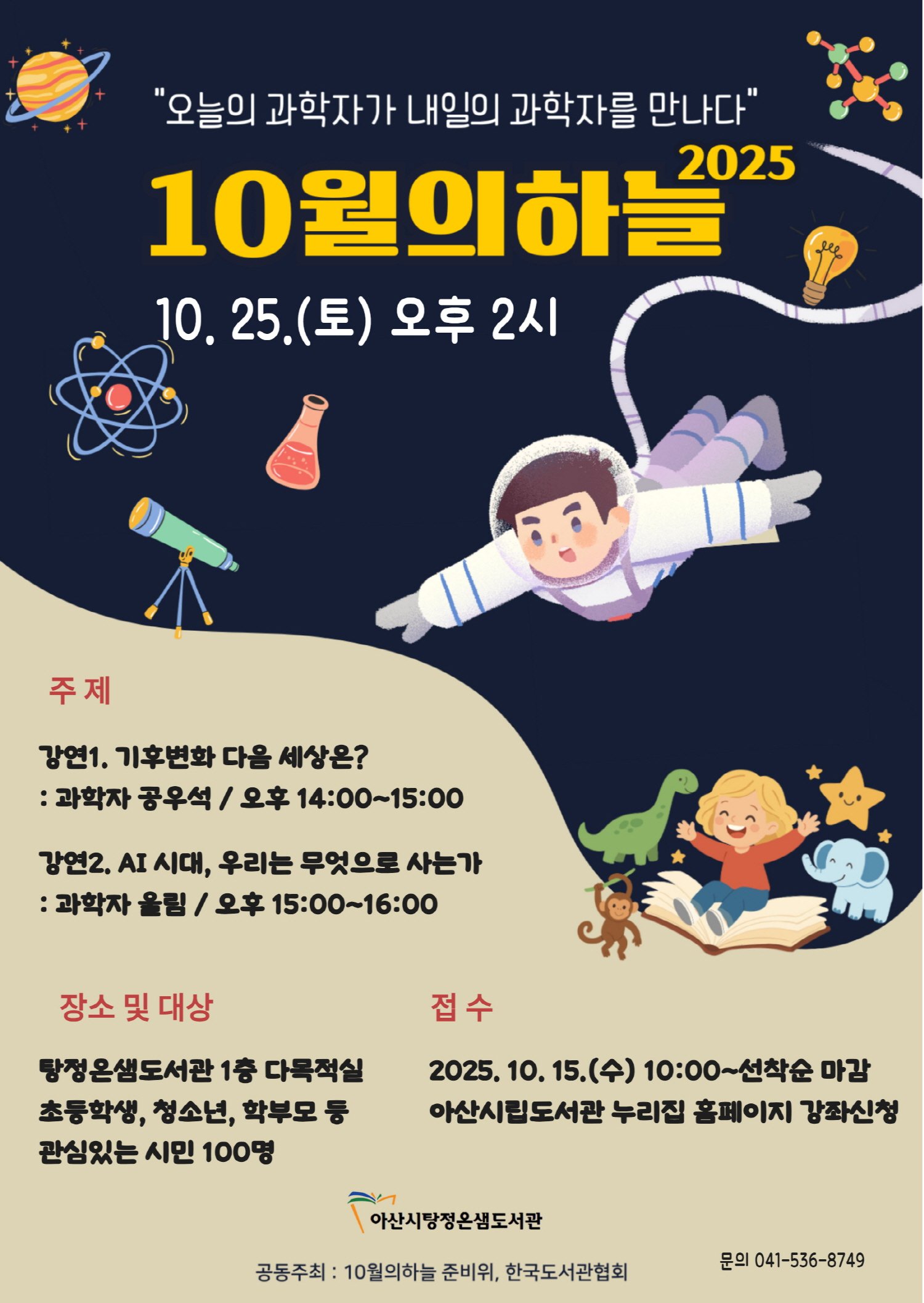 [충청25시] 아산시(시장 오세현)는 오는 25일(토), 탕정온샘도서관과 꿈샘어린이청소년도서관에서 ‘10월의 하늘’ 과학 강연을 개최한다고 밝혔다.