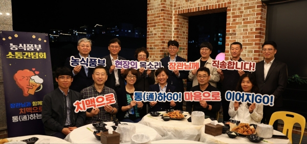 [충청25시] 송미령 농림축산식품부 장관은 10월 16일 저녁 세종시 소재 음식점에서 소통 간담회를 열고 공무원노동조합 농림축산식품부지부 임원진과 편안한 분위기 속에서 대화와 소통의 시간을 가졌다.