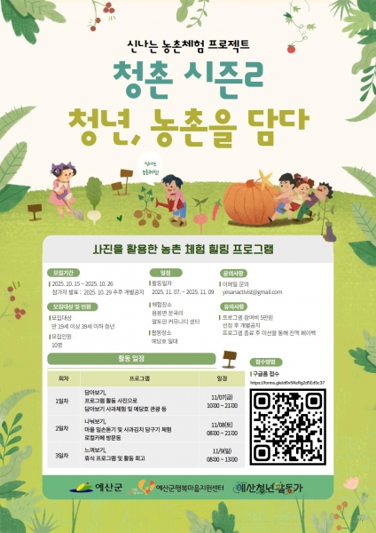 [충청25시] 예산군행복마을지원센터는 청년과 농촌이 함께 어우러지는 교류 프로그램 ‘청촌 시즌2’ 참가자를 오는 10월 26일까지 모집한다고 밝혔다.