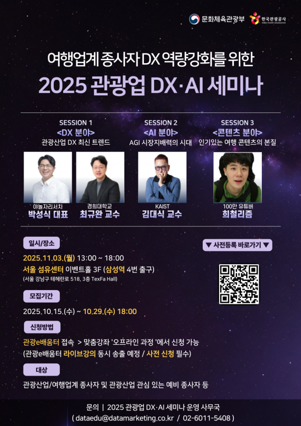 [충청25시] 문화체육관광부와 한국관광공사는 관광산업 종사자의 디지털전환, 인공지능과 연계한 역량 강화를 위해 11월 3일 서울 섬유센터 이벤트홀에서 ‘관광업 DX·AI 세미나’를 개최한다.