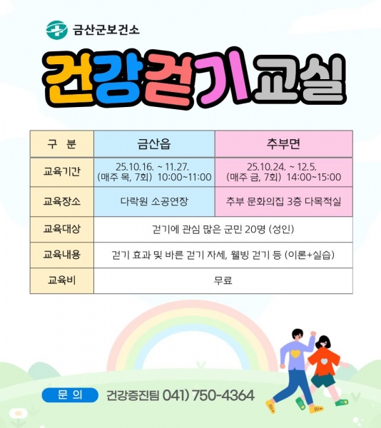 [충청25시] 금산군보건소는 군민의 건강증진과 생활 속 신체활동 실천을 위해 오는 12월까지 금산읍·추부면에서 건강 걷기 교실을 운영한다.