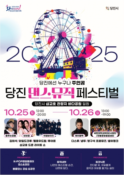 [충청25시] 당진시가 오는 25일과 26일 이틀간 삽교호 관광지 바다공원 일원에서 ‘2025년 당진 댄스&뮤직 페스티벌’을 개최하며 '춤과 음악으로 하나 되는 당진, 당진에선 누구나 주인공'이라는 주제로 화려한 가을 축제의 장을 펼친다.