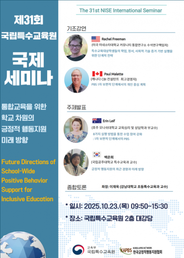 [충청25시] 국립특수교육원은 한국긍정적행동지원협회와 공동으로 10월 23일 ‘통합교육을 위한 학교 차원의 긍정적 행동지원 미래 방향’을 주제로 ‘제31회 국제세미나’를 개최한다.