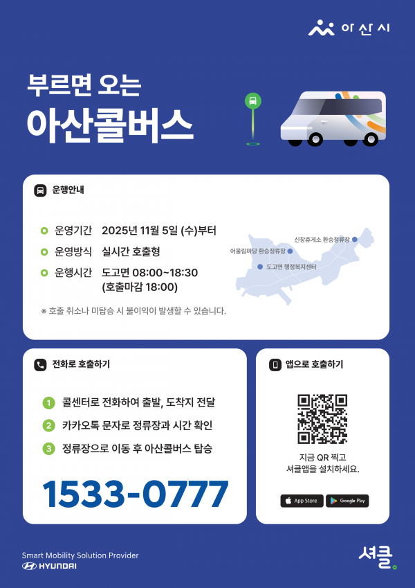 [충청25시] 아산시가 도고면 지역의 관광 활성화와 주민들의 이동 편의성 제고를 위해 오는 11월 5일부터 수요응답형 공공형 버스 ‘아산콜버스’를 시범 운행한다.