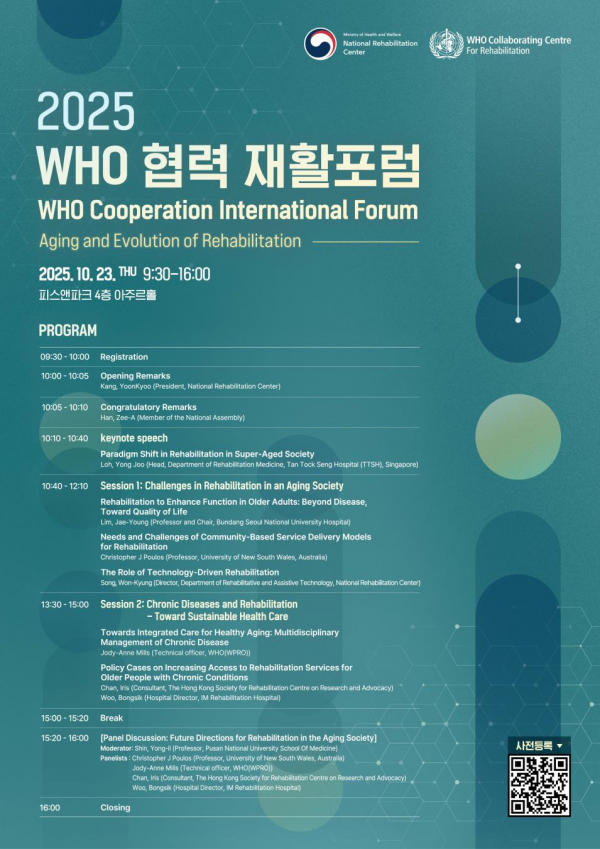 2부는 세계보건기구 서태평양지역사무처 조디 앤 밀스 재활담당관이 건강한 노화를 위한 통합 돌봄을 향해: 만성질환의 다학제적 관리에 대해 발표하고 만성질환 고령자의 재활서비스 접근성 향상을 위한 정책 사례를 주제로 홍콩 재활연구소 아이리스 찬 박사가 홍콩 사례를, 아이엠 재활병원 우봉식 원장이 한국 사례를 각각 발표한다.