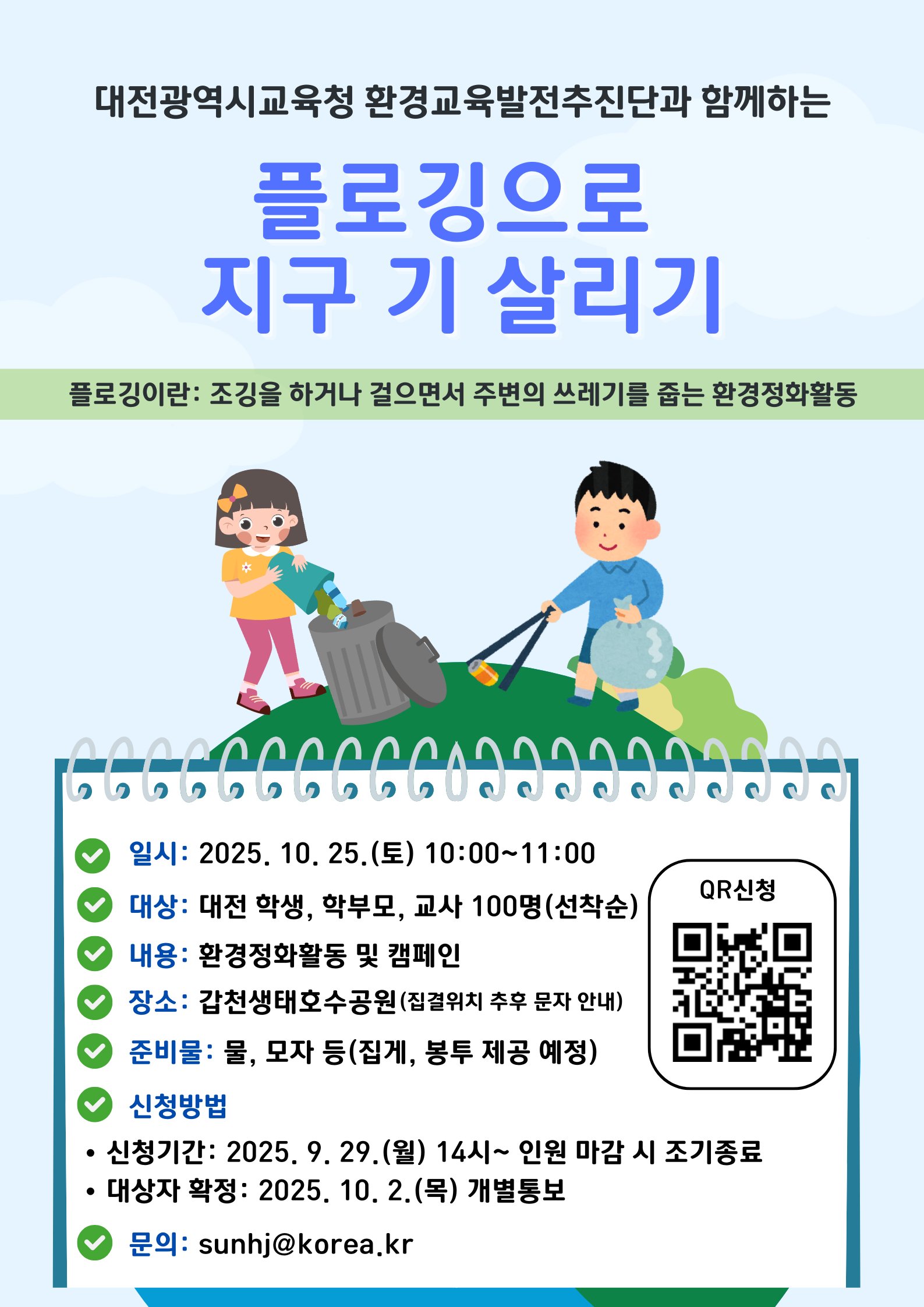 [충청25시] 대전시교육청은 10월 25일 갑천생태호수공원에서 가정·지역 연계 생태전환교육 실천 확산을 위한 2025년‘지구 기살리기 캠페인’플로깅을 실시한다고 밝혔다.