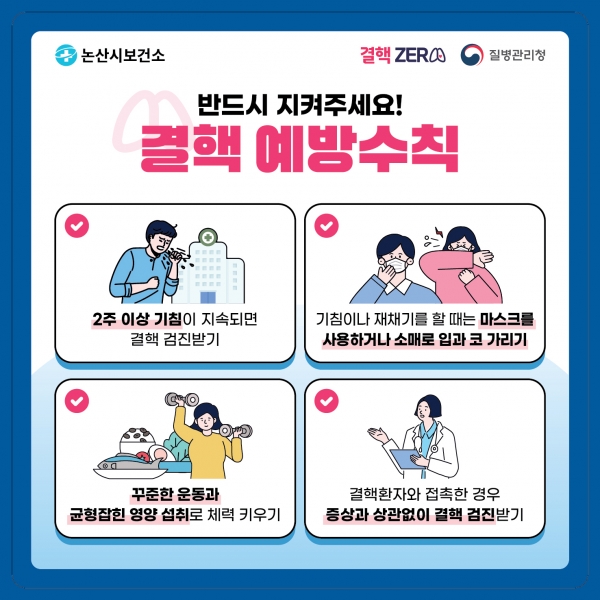2주 이상 기침, 체중 감소, 발열 등 결핵 주요 증상이 있거나 결핵 환자와 접촉했을 경우 논산시보건소 1층 만성병관리실로 문의하면 도움을 받을 수 있다.