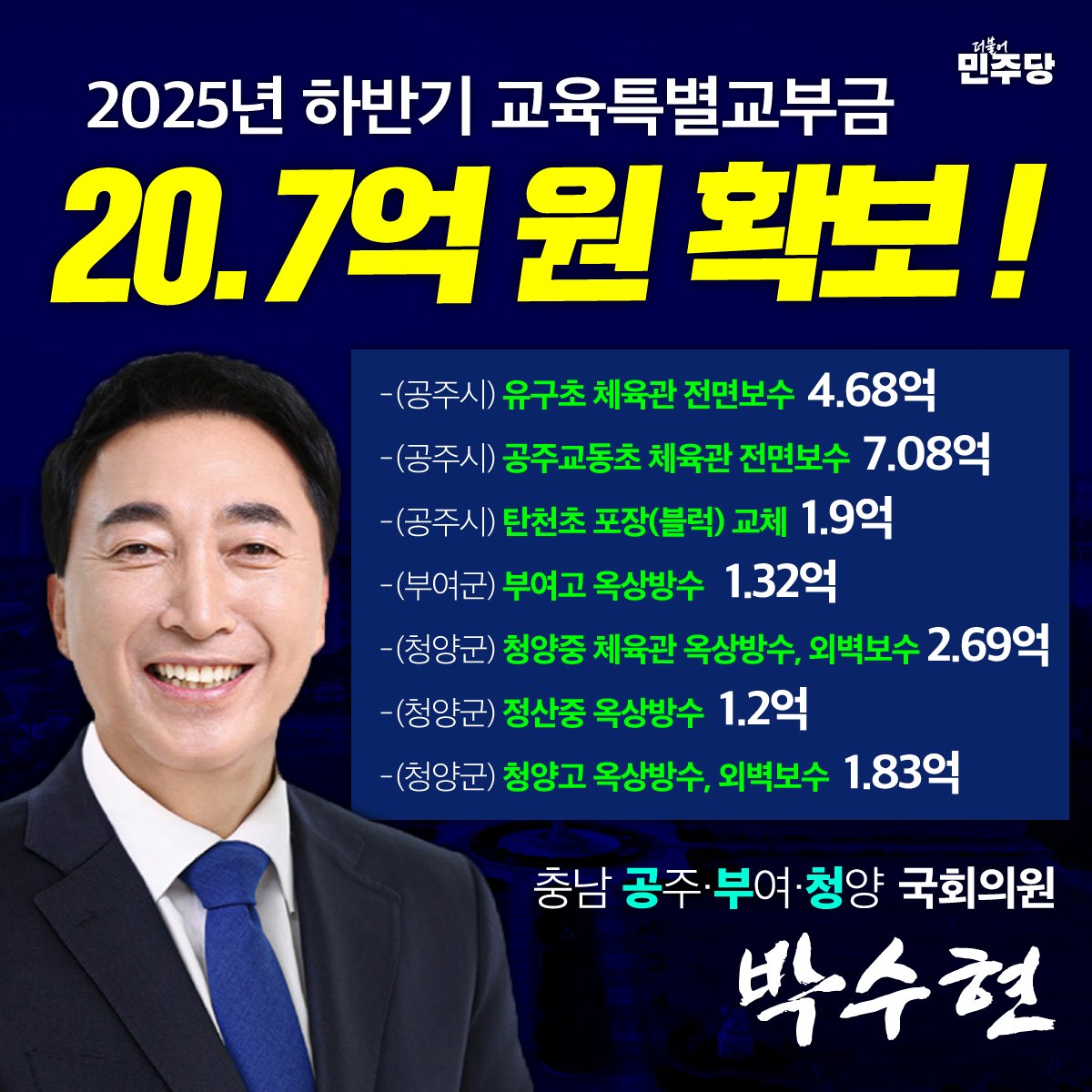 [충청25시] 박수현 국회의원(더불어민주당·공주·부여·청양)이 교육부 '지역 교육현안 특별교부금'총 20억 7천만원을 확보했다.