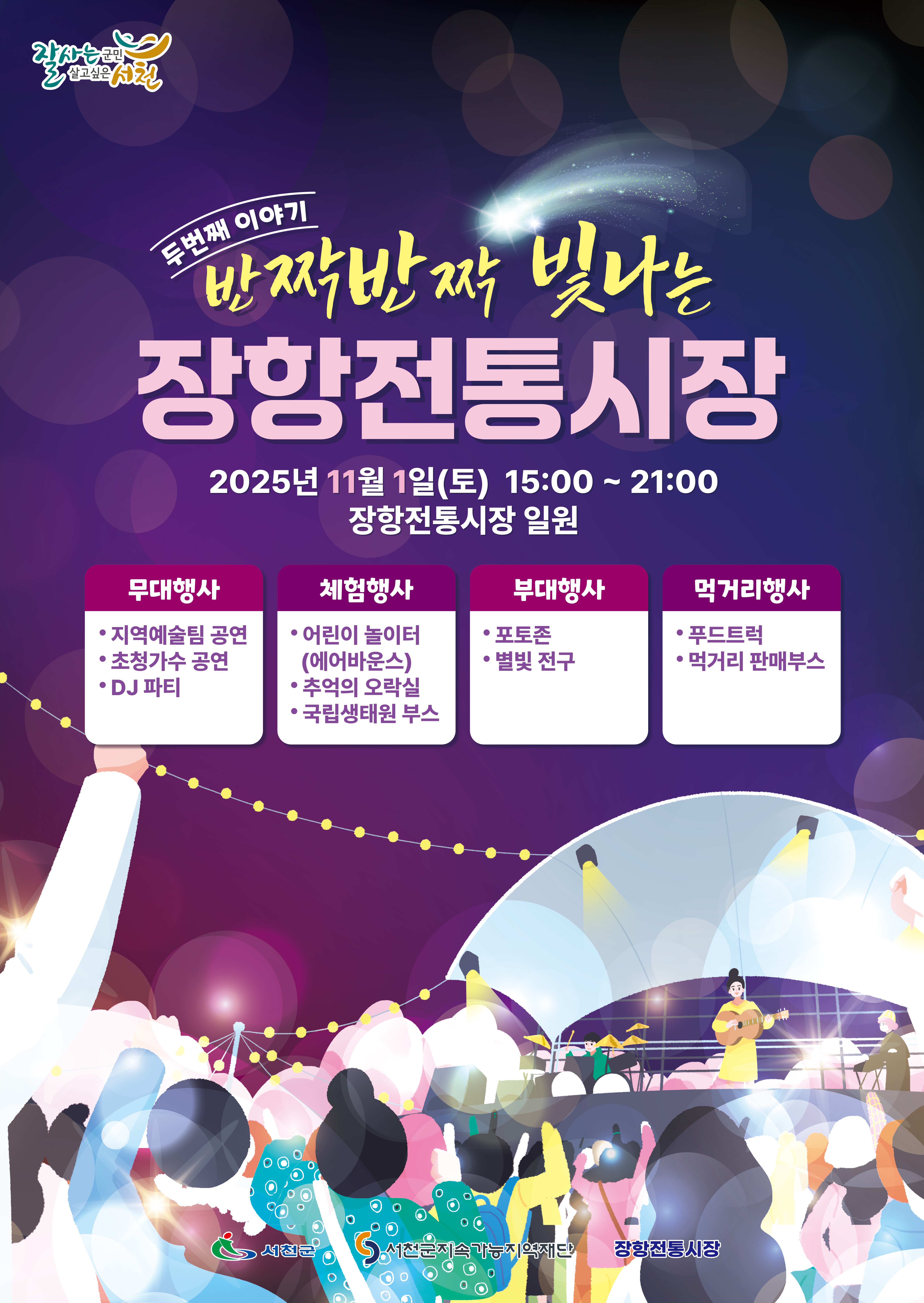 장항전통시장의 활성화를 위해 진행하는 이번 행사는 11월 1일 토요일 오후 3시부터 밤 9시까지 진행되며 ▲문화공연 ▲DJ 파티 ▲경품추첨 ▲어린이 놀이터(에어바운스, 오락실) ▲만들기 체험 ▲행운의 뽑기 등 다양한 프로그램으로 구성되어 있다.