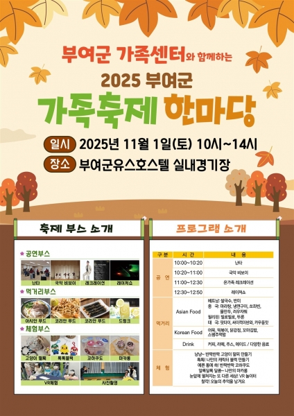 [충청25시] 부여군 가족센터는 오는 11월 1일 오전 10시부터 오후 2시까지 부여군유스호스텔 실내경기장에서 ‘2025년 부여군 가족축제 한마당’을 개최한다고 밝혔다.