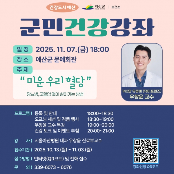 [충청25시] 예산군은 오는 11월 7일 오후 6시 30분 예산군문예회관에서 ‘서울아산병원 우창윤 교수 초청 군민건강강좌’를 개최한다.