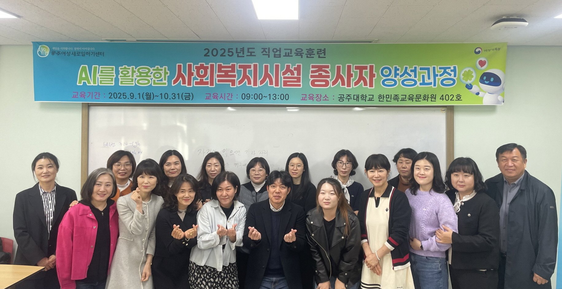 [충청25시] 공주여성새로일하기센터는 지난 31일 국립공주대학교 옥룡캠퍼스 평생교육원에서 국비지원 직업교육훈련 ‘인공지능(AI)을 활용한 사회복지시설 종사자 양성과정’을 성공적으로 마무리했다고 밝혔다.