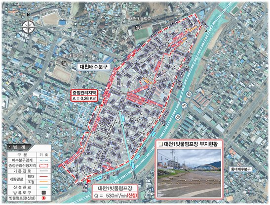 보령시는 2026년부터 약 236억원을 순차적으로 투입해 대천처리분구 0.26㎢ 내 △우수관로 교체 L1,771m △우수관로 신설 L864m △빗물펌프장 1개소 설치 등을 추진할 계획이다.