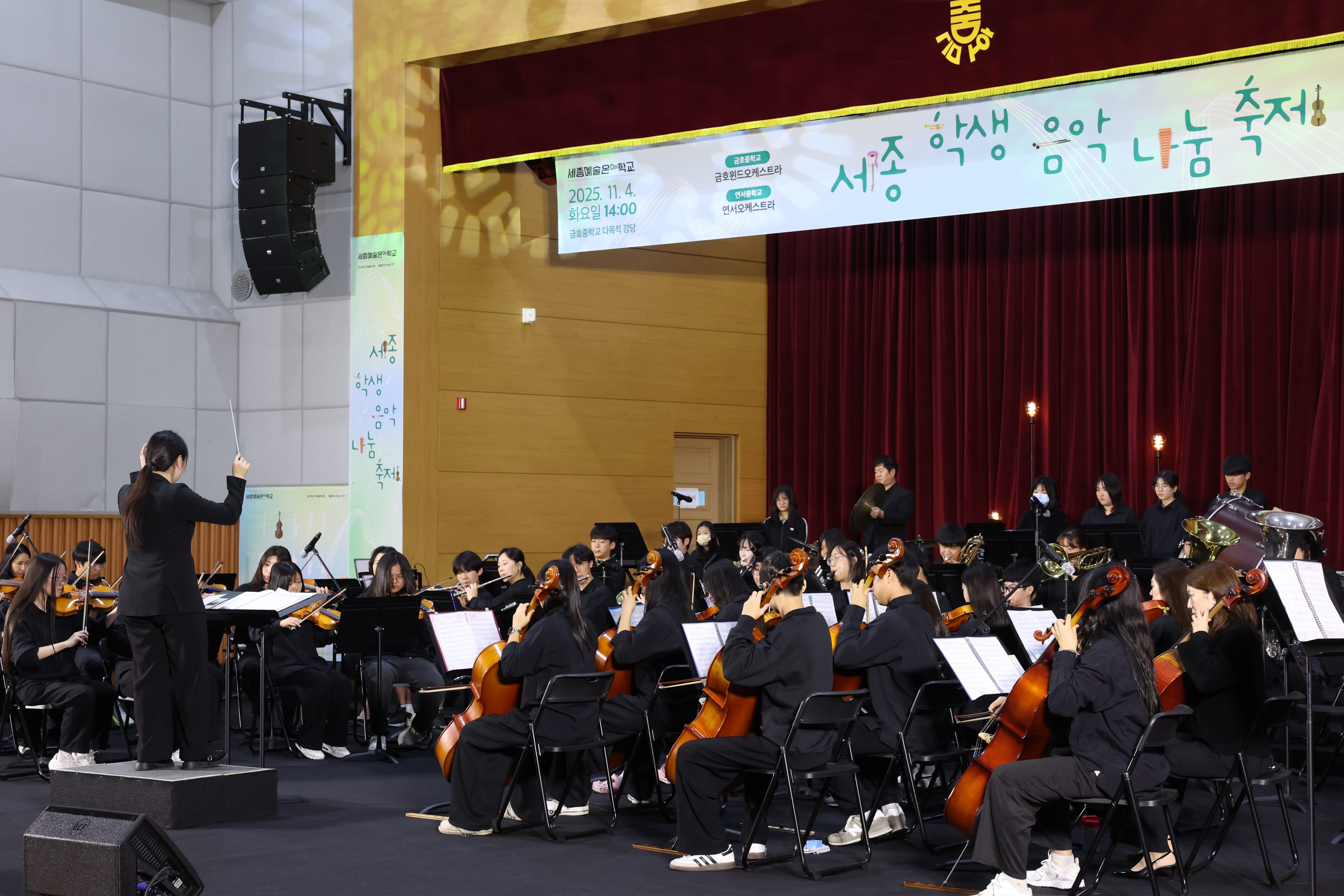 [충청25시] 세종시교육청은 11월 4일에 금호중학교 다목적강당에서 금호중학교의 ‘금호윈드오케스트라’와 연서중학교의 ‘연서오케스트라’가 함께 만드는 ‘2025 세종예술온학교’예술학교 ‘세종 학생 음악 나눔 축제’를 성황리에 마쳤다.