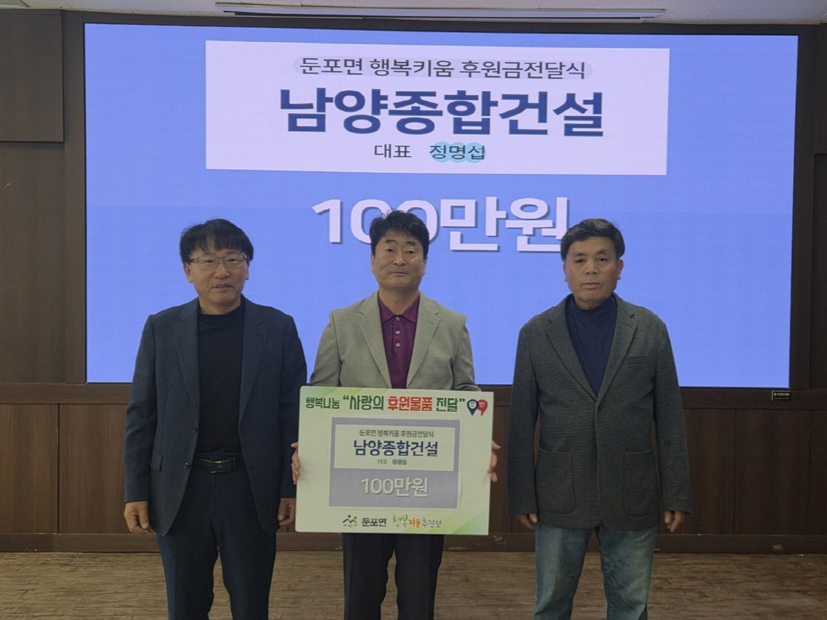 [충청25시] 아산시 둔포면 행복키움추진단은 7일 남양종합건설㈜로부터 관내 취약계층 지원을 위한 이웃사랑 후원금 100만원을 전달받았다.
