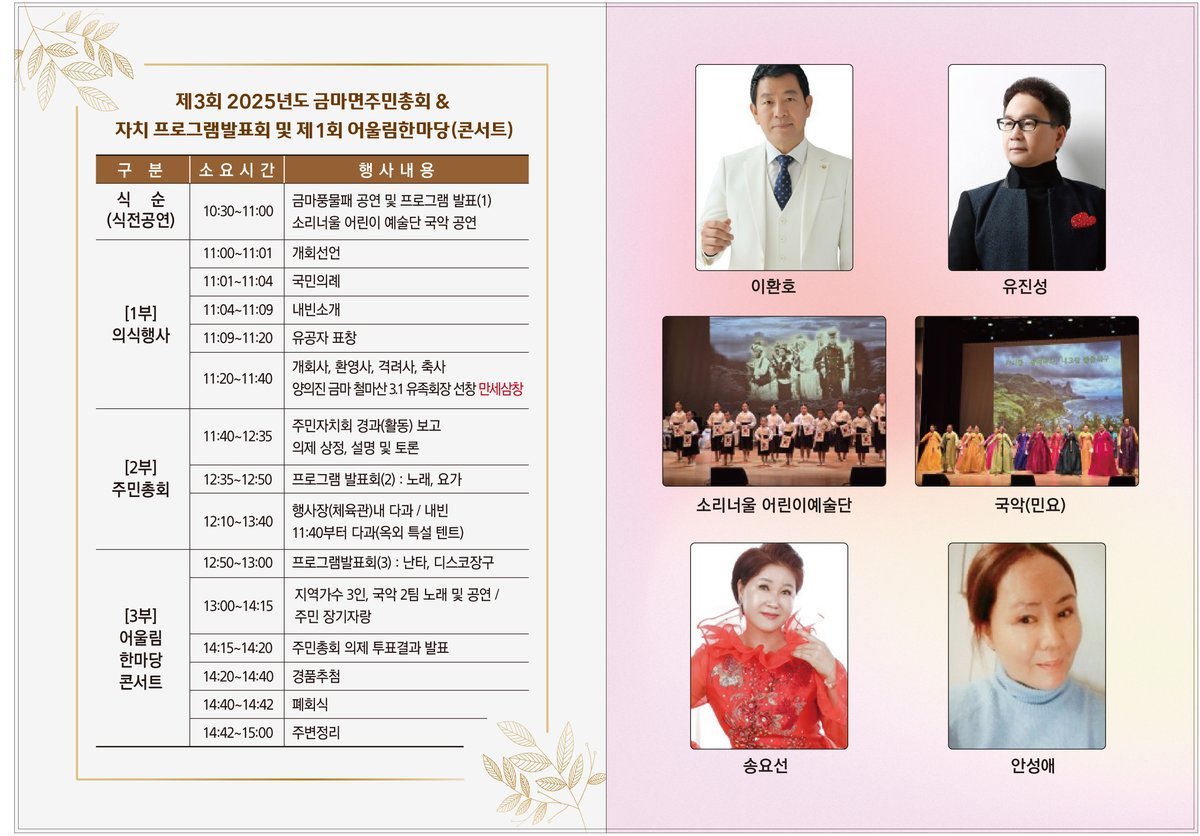 [충청25시] 홍성군 금마면주민자치회가 주민과 함께 만들어가는 행복마을 제3회 금마면주민총회 및 제1회 어울림한마당 콘서트를 오는 15일 금마초등학교 봉수관에서 개최한다,광복 80주년 및 철마산 3.1독립운동 106주년을 기념해 열리는 이번 금마면 주민총회는 금마 철마산 3.1독립운동 유족회가 올봄 펴낸 ‘실록 철마산 3.1 독립운동사’를 재편집해 수록한 특별한 주민총회 자료집을 발간, 제공함으로써 한국독립운동사에 찬란히 빛나는 선조들의 애국·애족 정신을 일깨워주는 계기로 삼는다는 데에 큰 의의가 있다.
