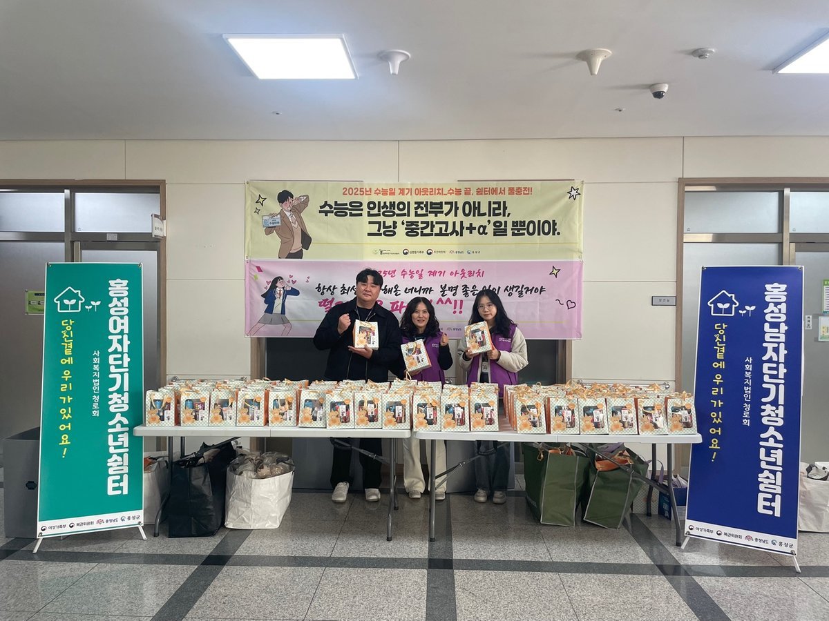 [충청25시] 홍성남자·여자단기청소년쉼터는 지난 11일 홍성고등학교에서 수험생들을 응원하는 ‘수능일 계기 홍보 아웃리치’활동을 실시했다고 밝혔다.