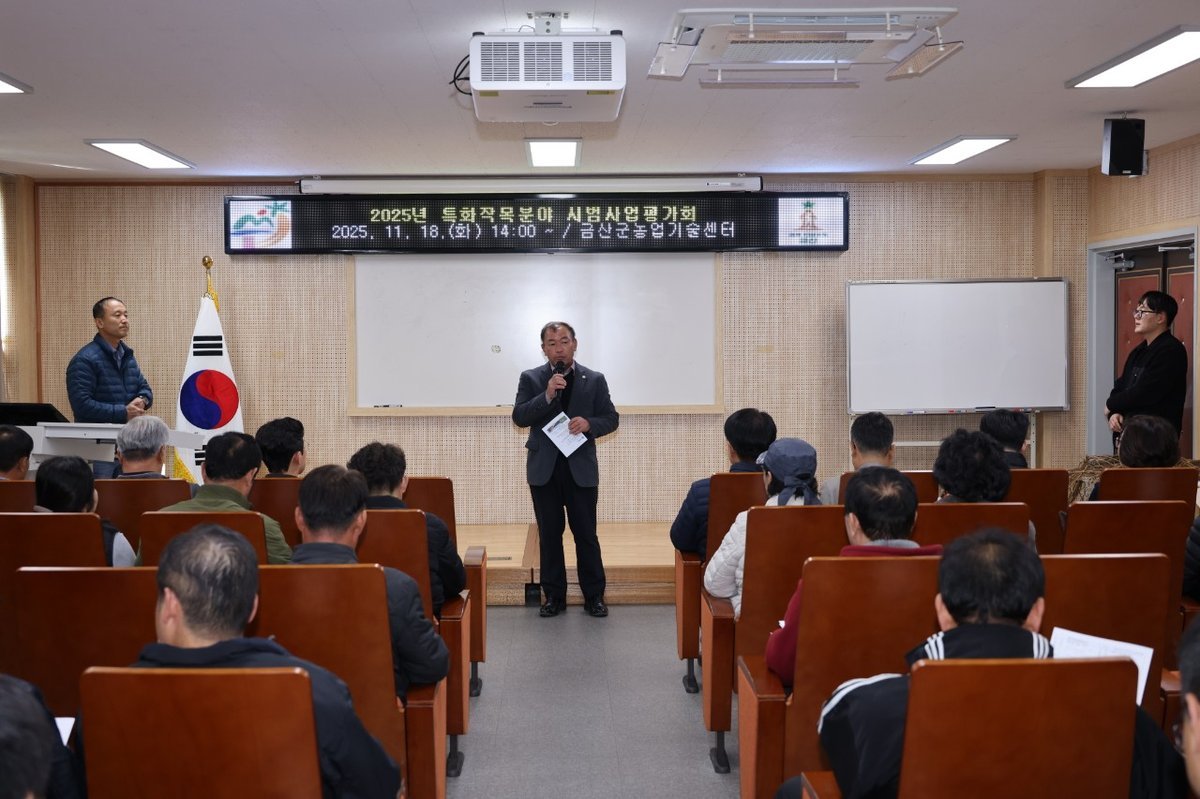 [충청25시] 금산군농업기술센터는 지난 18일 센터 농업인교육장 및 시범사업장에서 특화작목분야 재배 시범사업 평가회를 개최했다.