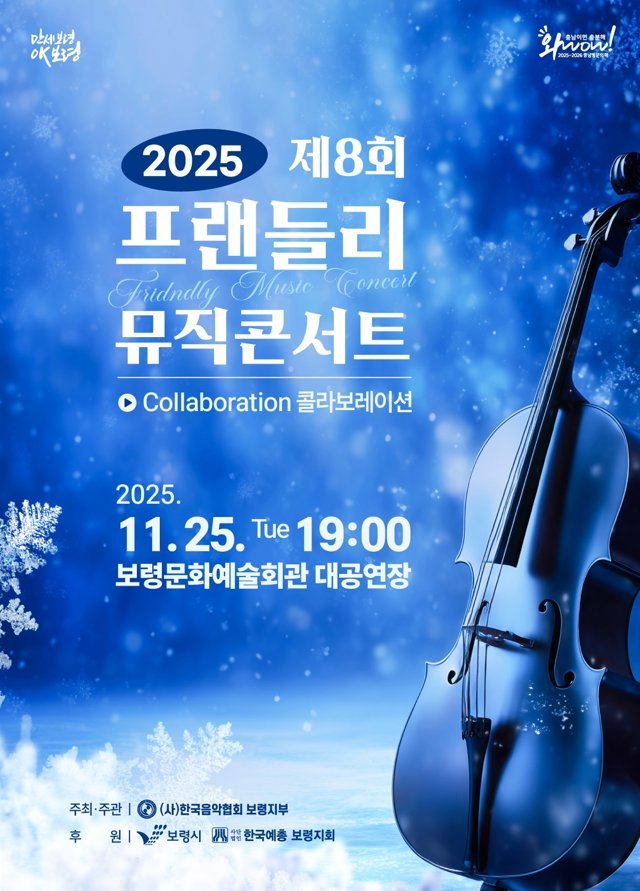 [충청25시] 한국예총 보령지회 음악지부가 주관하는 ‘제8회 프렌들리 음악회’가 오는 11월 25일 오후 7시 보령문화예술회관 대공연장에서 개최되어 보령시민들에게 특별한 문화향유의 기회를 제공한다.