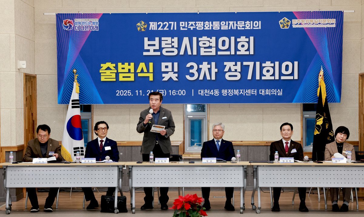 [충청25시] 민주평화통일자문회의 보령시협의회는 지난 21일 대천4동 행정복지센터 대회의실에서 김동일 보령시장과 정윤 민주평통 충남부의장, 자문위원 등 60명이 참석한 가운데 ‘제22기 출범식 및 2025년 3차 정기회의’를 개최했다.
