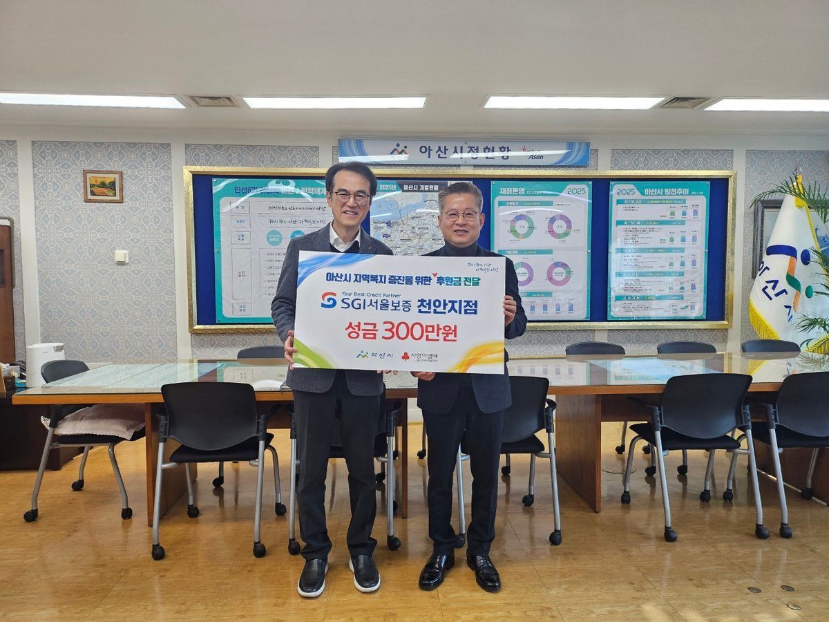 [충청25시] 아산시는 SGI서울보증 천안지점이 24일 지역사회 사회복지시설 지원을 위한 성금 300만 원을 전달했다고 밝혔다.