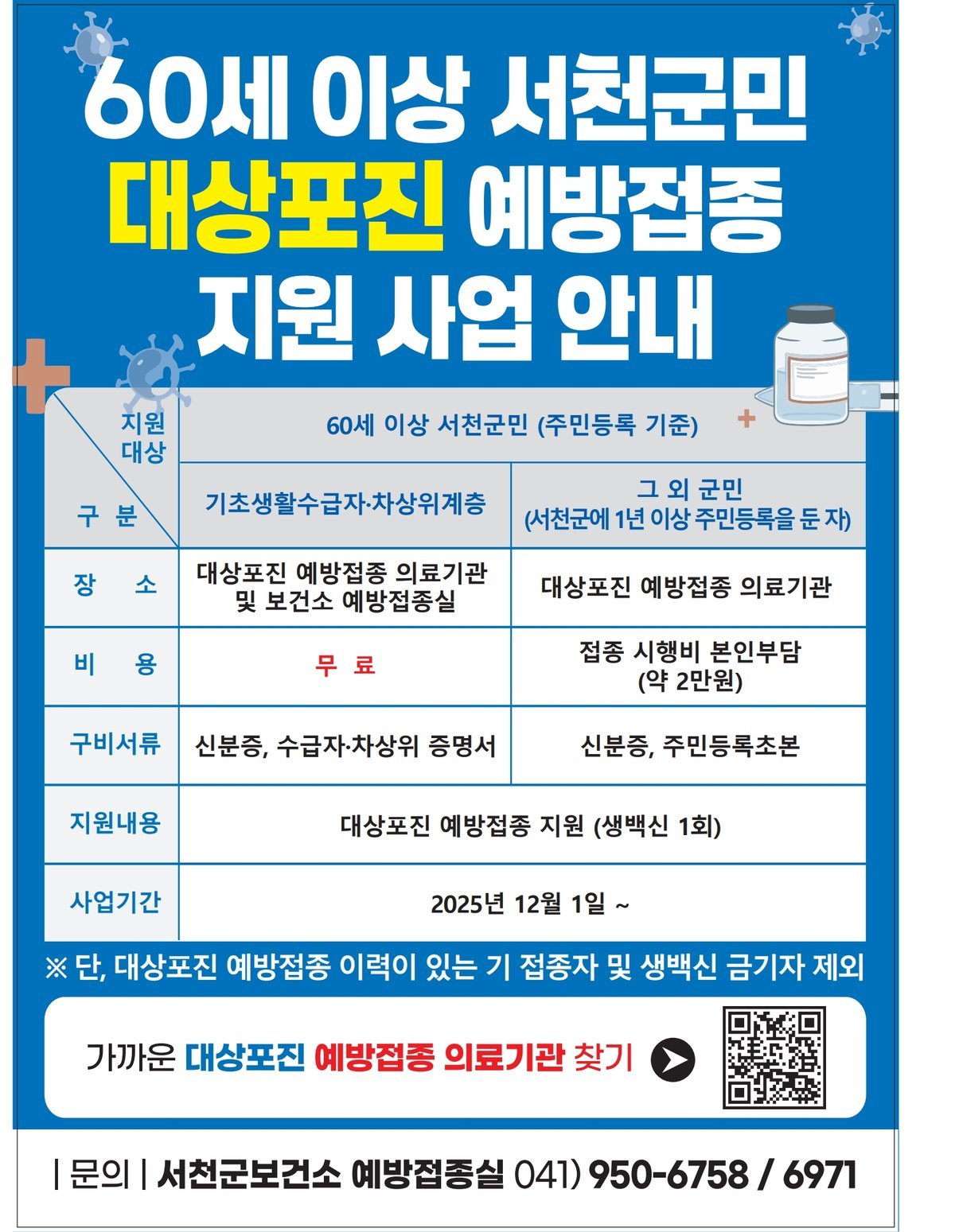 [충청25시] 서천군은 고령층의 대상포진 발병과 합병증을 예방하고 건강한 노후를 지원하기 위해 오는 12월 1일부터 대상포진 예방접종 지원사업을 본격 추진한다.