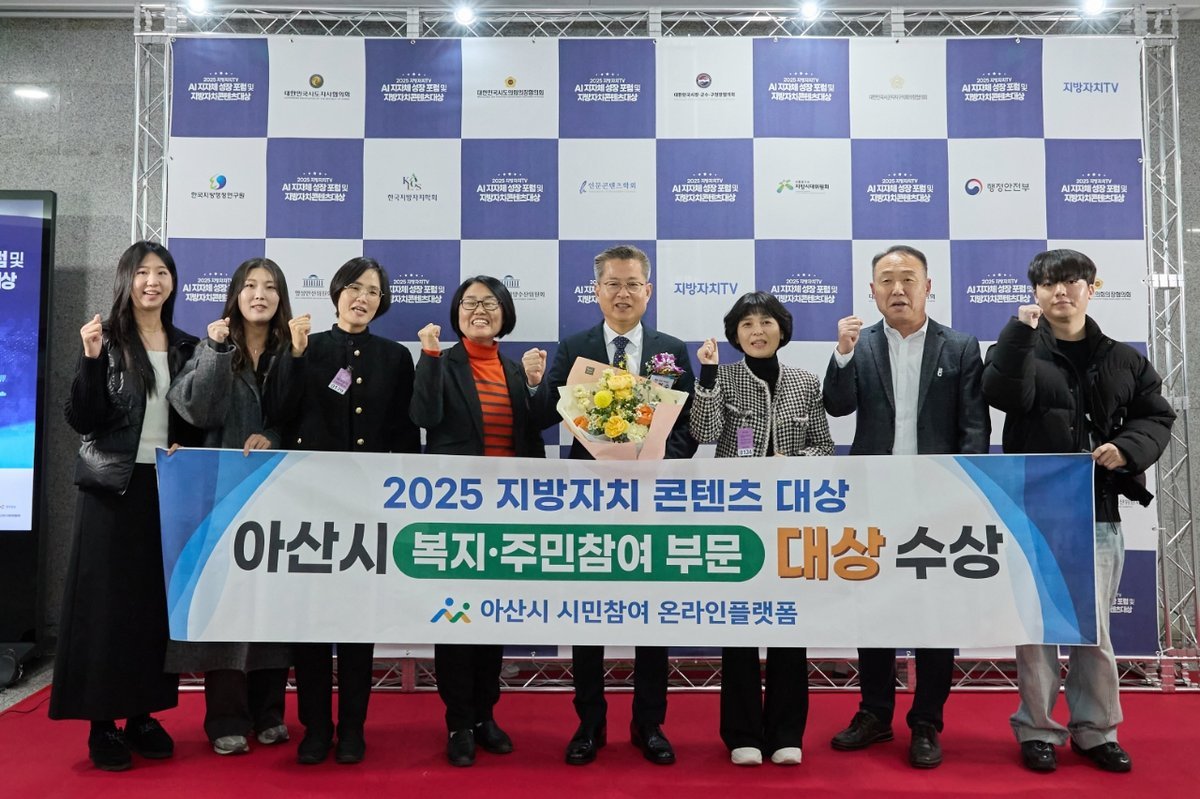 [충청25시] 아산시가 27일 국회의원회관 대회의실에서 열린 ‘2025 지방자치 콘텐츠대상’에서 기초자치단체 복지·주민참여 부문 대상을 수상했다.