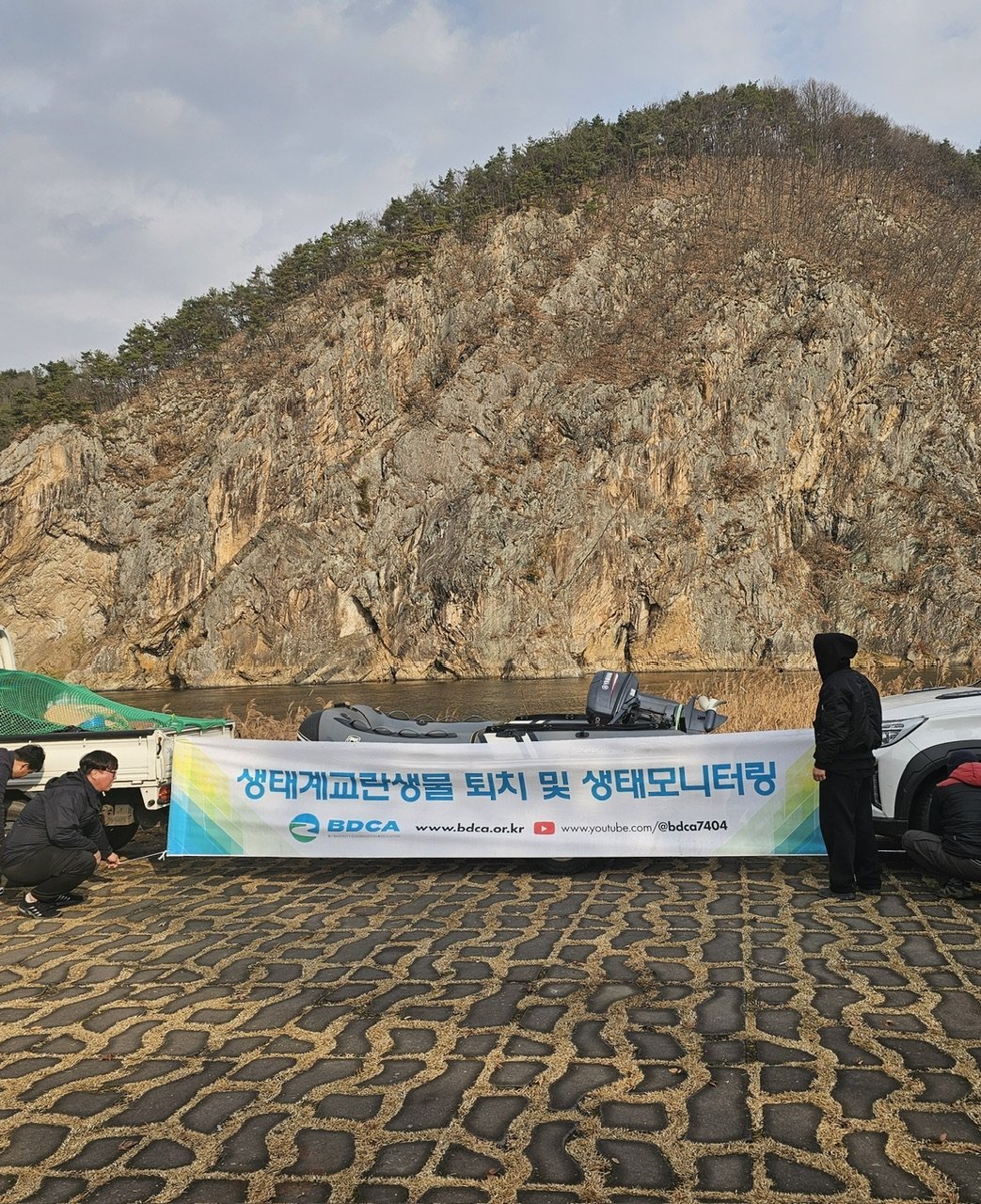 금산군 생태계 교란어종 퇴치 사업 관계자들이 활동에 나서며 현수막을 설치하고 있다.