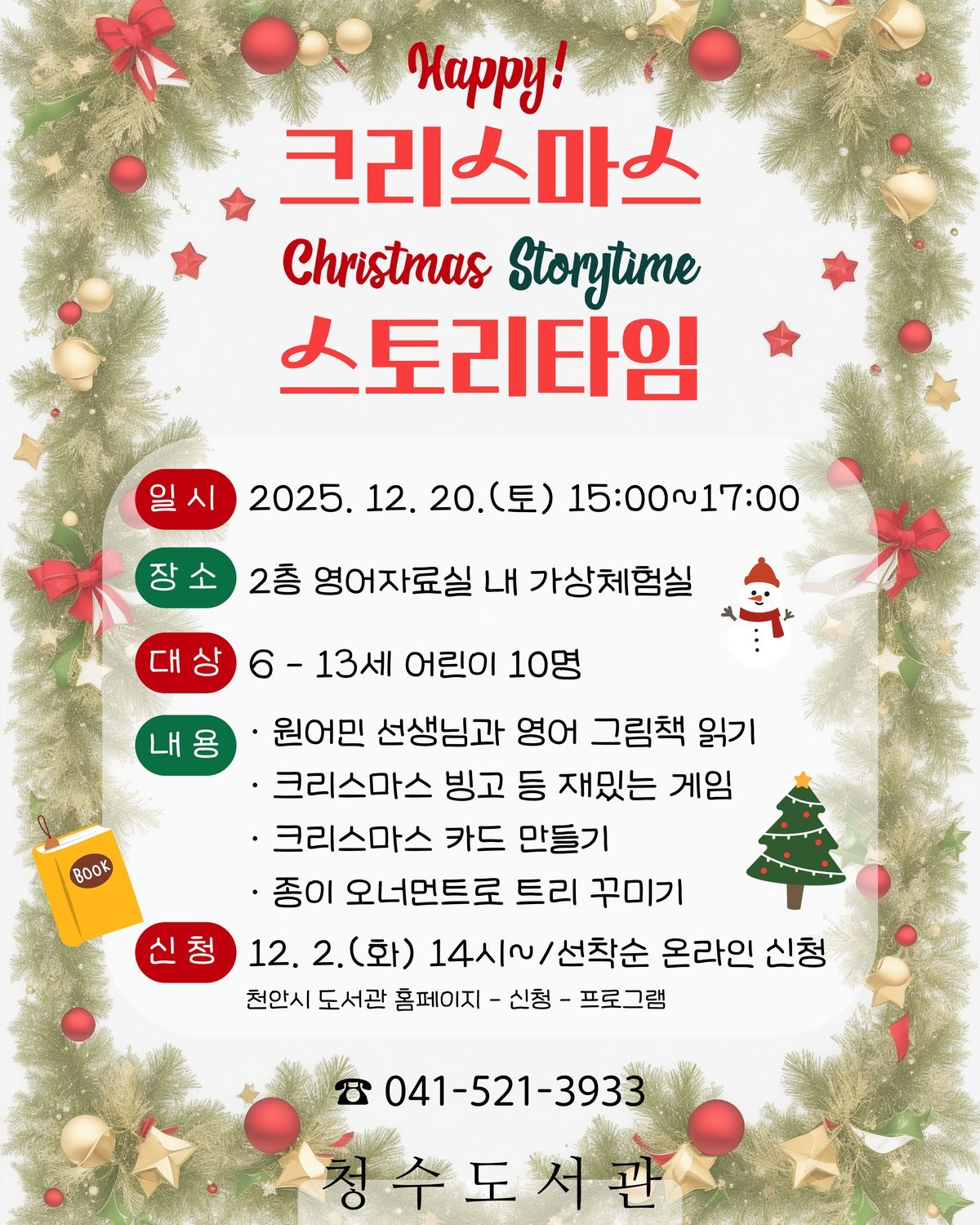 [충청25시] 천안시 청수도서관은 오는 20일 ‘해피 크리스마스 스토리타임’ 프로그램을 운영한다고 2일 밝혔다.