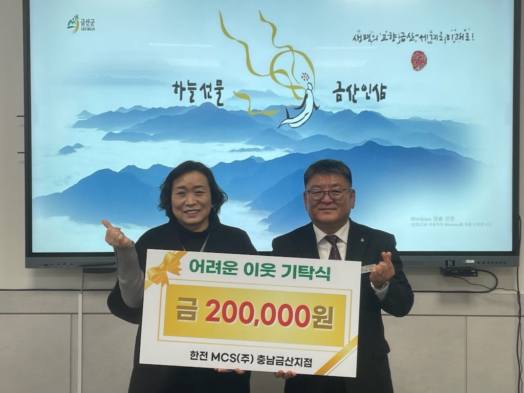 이번 기탁은 지역 내 소외계층 지원과 복지 증진을 위해 마련됐으며 기탁식에 이기영 금산읍장, 한재경 한전엠씨에스 금산지점장 등 관계자가 참석했다.