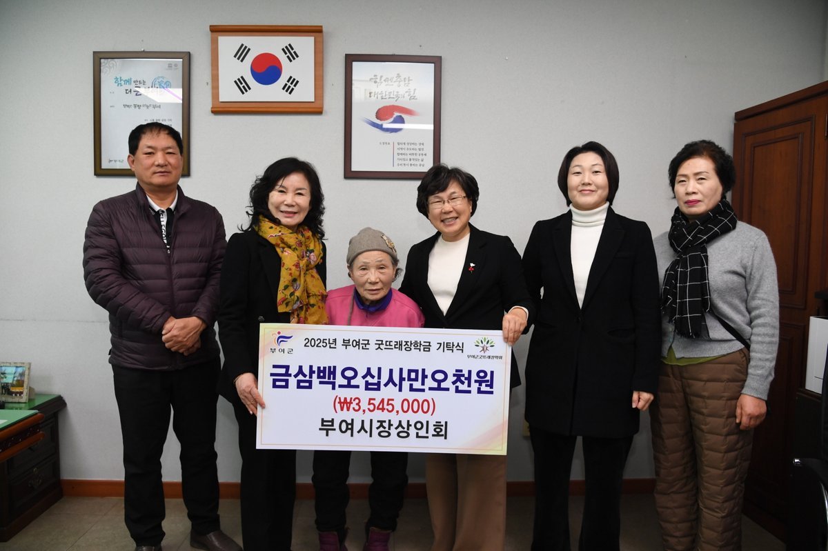 [충청25시] 부여시장상인회는 지난 2일 부여군청을 방문하여 인재 육성을 위한 장학금 354만 원을 부여군굿뜨래장학회에 기탁하였다.
