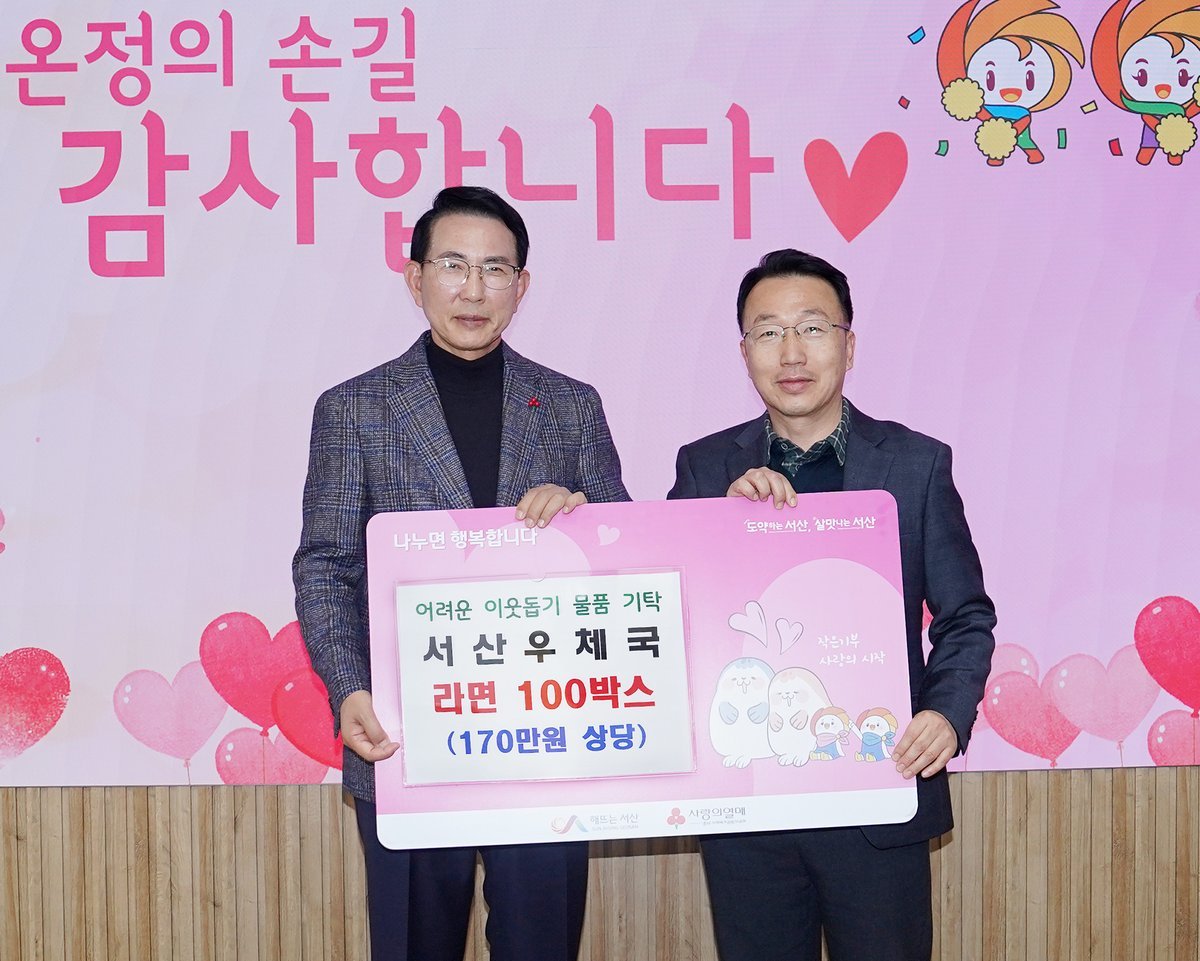 [충청25시] 충남 서산시는 5일 서산우체국에서 어려운 이웃을 돕기 위해, 170만 원 상당의 라면 100박스를 기탁했다고 밝혔다.