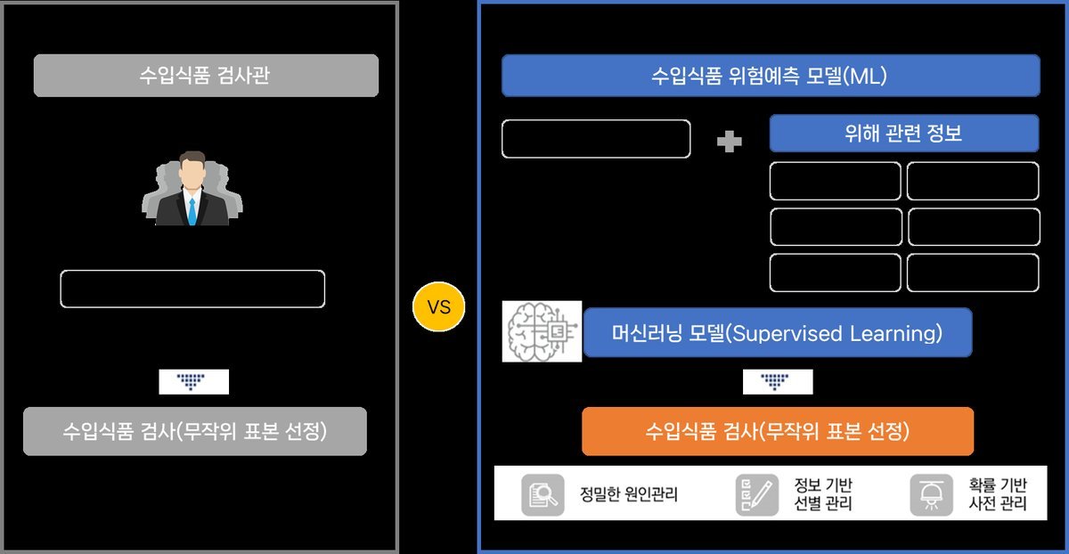 ‘인공지능 기반 수입식품 위험예측 검사시스템’은 축적된 과거 부적합 내용, 원재료 등 수입식품 검사 정보와 해외 환경·위해정보를 융합한 빅데이터를 인공지능이 학습하여 부적합 가능성이 높은 수입식품을 통관 단계에서 무작위검사* 대상으로 자동 선별하는 모델이다.