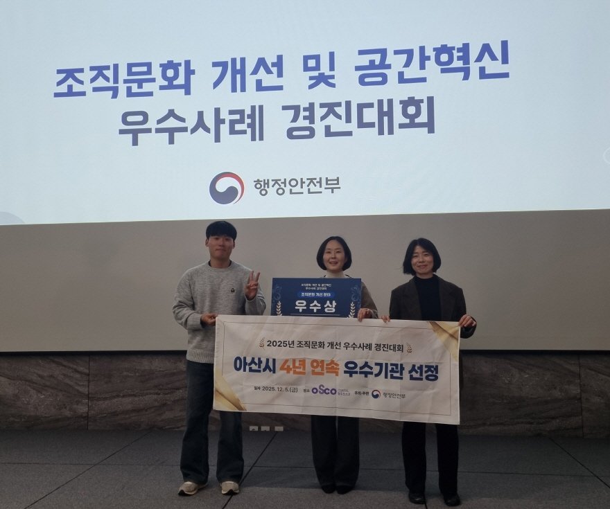 [충청25시] 아산시는 5일 청주 오송컨벤션센터에서 열린 행정안전부 주관 ‘2025년 조직문화 개선 우수사례 경진대회’에서 우수상을 수상했다.
