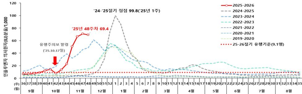인플루엔자는, 유행주의보 발령 이후 의사환자* 발생이 증가하며 유행 중이다. 11월 4주 인플루엔자 의사환자 분율**은 의원급 외래환자 1,000명당 69.4명으로 전주보다 소폭 감소했으나, 예년 동기간보다는 높은 수준이다.