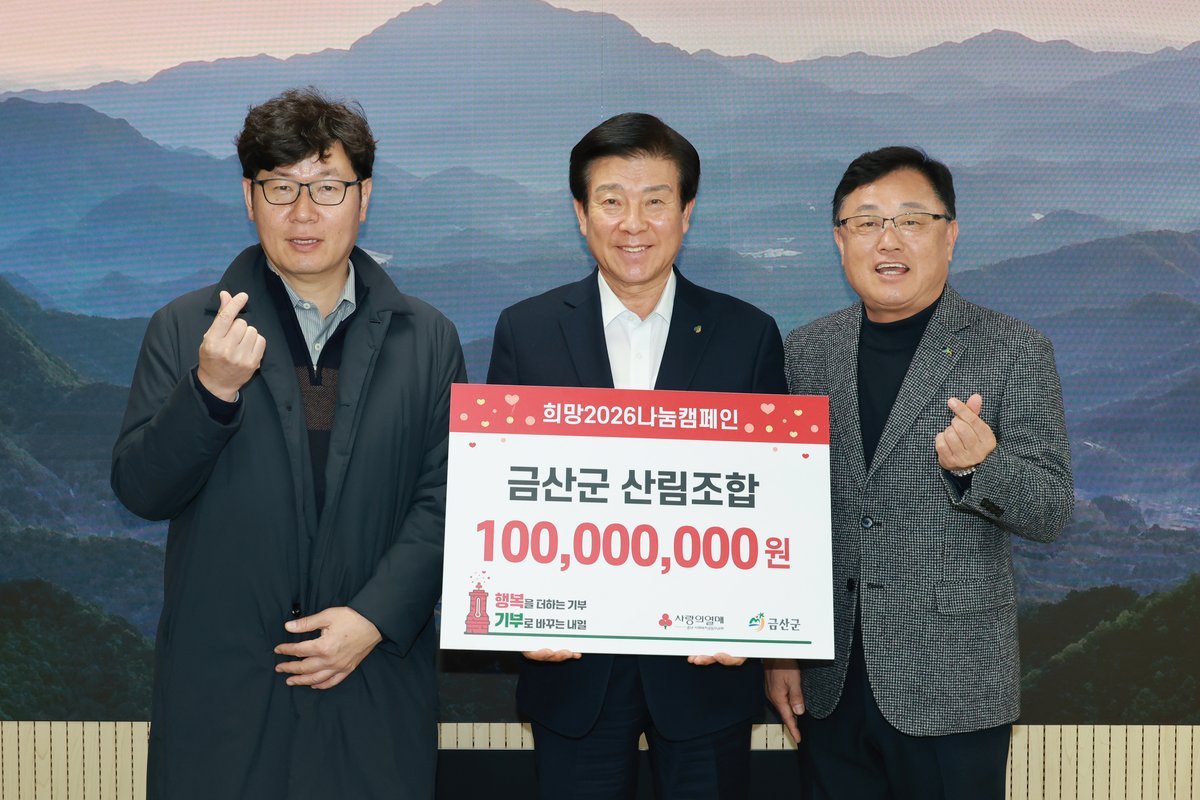 [충청25시] 금산군산림조합은 지난 9일 금산군청을 방문해 2026 희망나눔캠페인 성금 1억 원을 기탁하며 지역사회 나눔 실천에 앞장섰다.