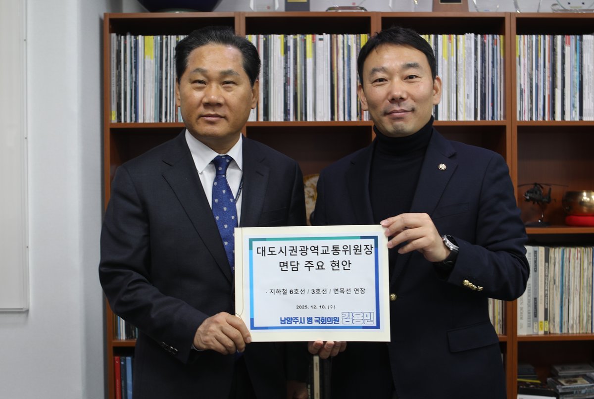 [충청25시] 더불어민주당 김용민 국회의원은 오늘 국토교통부 대도시권광역교통위원회 위원장을 만나 △지하철 6호선 남양주 연장 △지하철 3호선 남양주 연장 △면목선 남양주 연장 등 남양주 핵심 철도 현안에 대해 집중 논의하고, 제5차 대도시권 광역교통 시행계획에의 반영과 대광위의 적극적인 권한 행사 및 조정 역할을 강력히 요청했다.