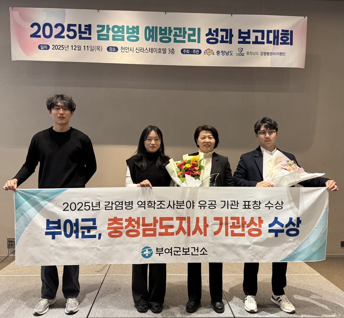 [충청25시] 부여군보건소는 충남도청에서 개최된 「2025년 감염병 예방 관리 성과 보고대회」에서 감염병 역학조사 분야 유공 기관으로 충청남도지사 기관 표창을 받았다고 12일 밝혔다.
