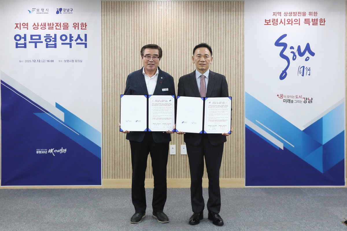 [충청25시] 보령시는 지난 12일 시청 민원동 회의실에서 서울특별시 강남구와 지역 상생발전을 위한 업무협약을 체결했다고 밝혔다.