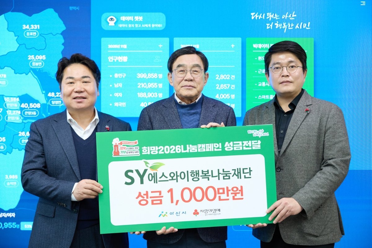 [충청25시] 에스와이행복나눔재단이 15일 아산시에 방문해 ‘희망2026나눔캠페인’성금 1000만 원을 기탁했다.