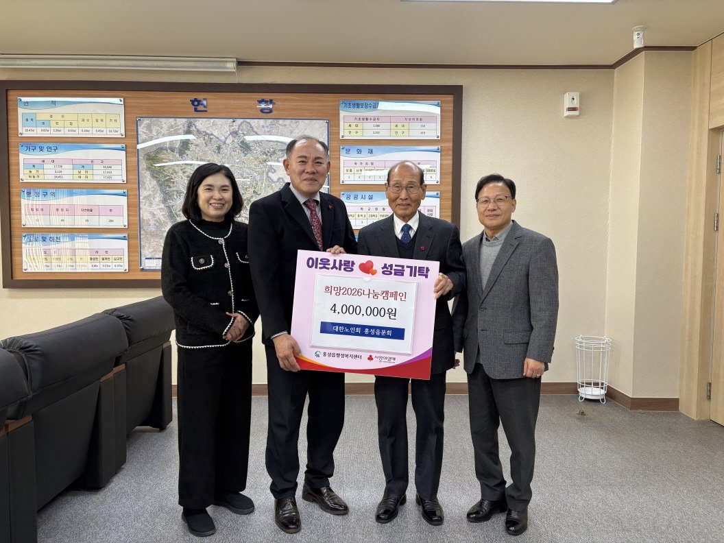 [충청25시] 대한노인회 홍성읍분회는 지난 17일 홍성읍 행정복지센터를 방문해 ‘희망2026 이웃돕기 성금’으로 400만 원을 기탁하며 지역사회에 따뜻한 나눔을 실천했다.