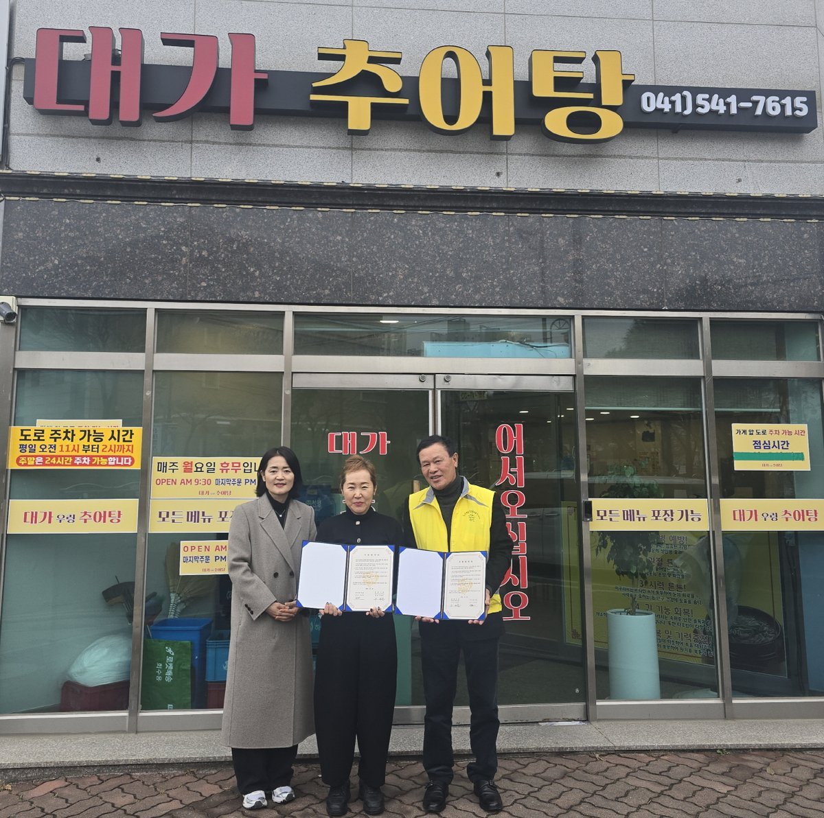 이번 협약에 따라 대가추어탕은 매월 정기 후원금을 지원하기로 했으며, 후원금은 온양4동 관내 취약계층 가정을 돕기 위한 복지사업에 활용될 예정이다.