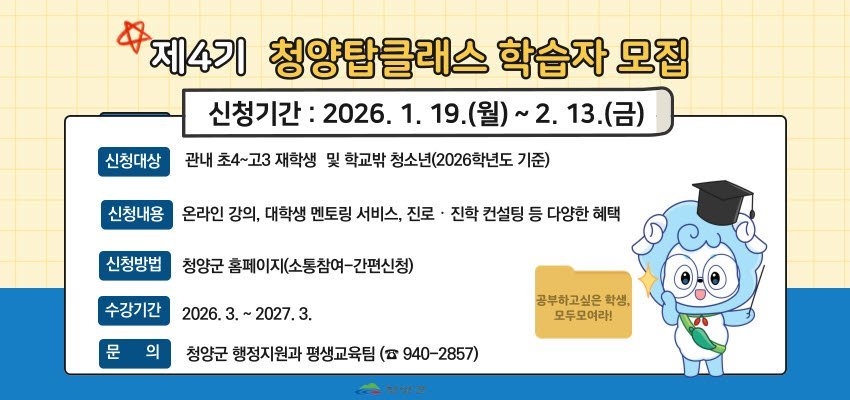 [충청25시] 청양군이 지역 학생들에게 수도권 수준의 고품격 교육 콘텐츠를 제공해 도농간 교육 격차를 줄이고 인재 유출을 막기 위한 ‘제4기 청양 탑클래스 학습지원’사업을 본격 추진한다.